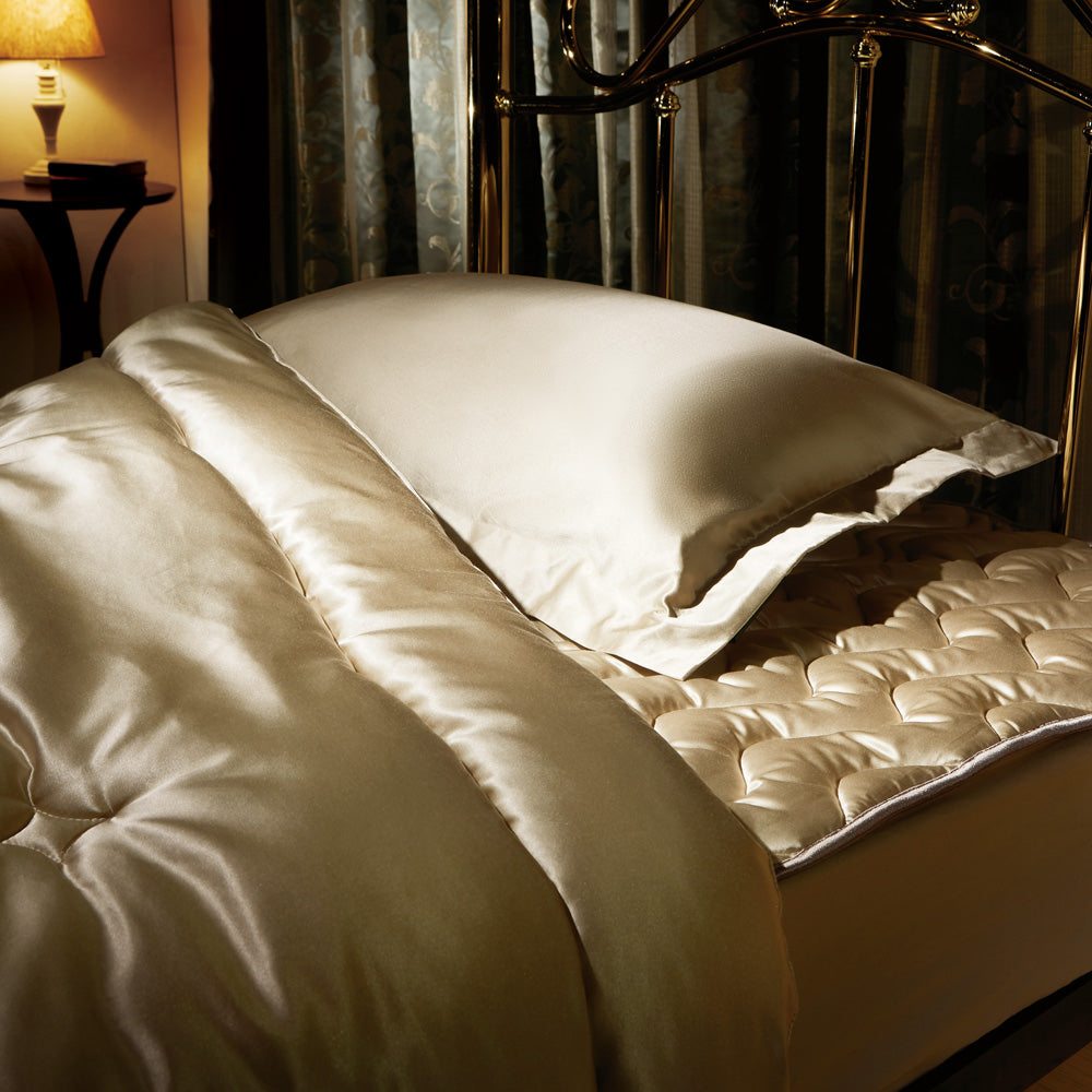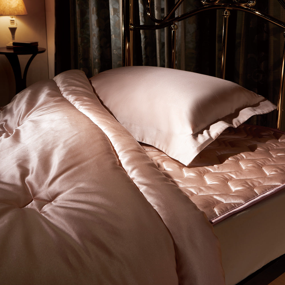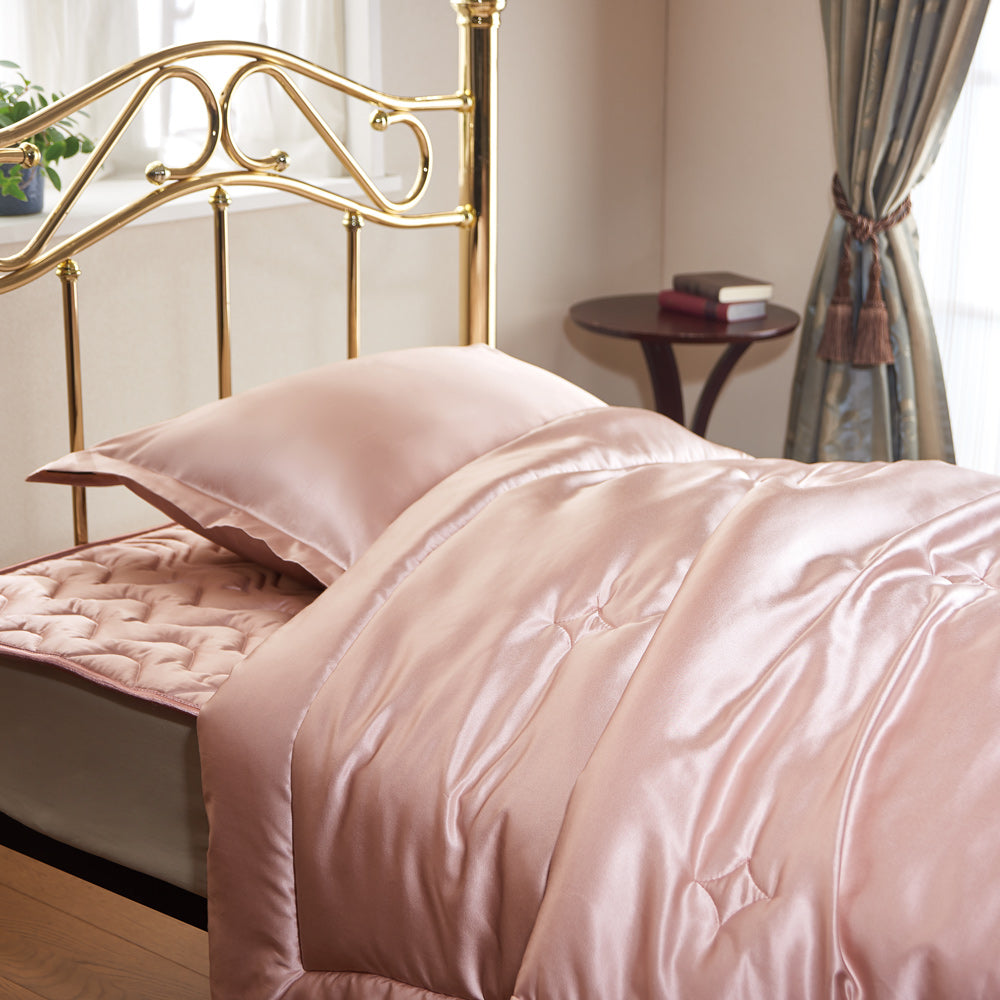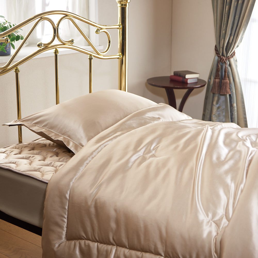 アパレル用品にも使用される上質なシルク家蚕100%を採用することで、しっとり、なめらかさは極上で上品な光沢さがあります。