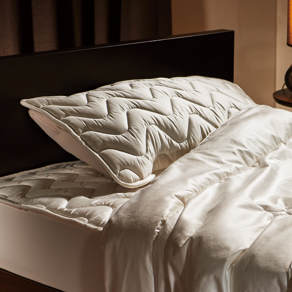 SILK SKIN TSUMUGU(シルクスキン ツムグ)は、シルクとコットンそれぞれの特性を生かし「毎日使える高級シルク寝具」をコンセプトに作られました。シルクの枕パッドは、簡単に着脱ができるゴムバンド仕様です。肌にやさしいだけでなく、摩擦を抑え髪のダメージを軽減するシルク素材。また、こもりがちな頭部の熱と汗を吸収しムレずに逃してくれるため快適な睡眠へ繋がります。デリケートなシルク生地ですが、コットンが加わることでご自宅で気軽に洗えるシルク寝具が実現しました。