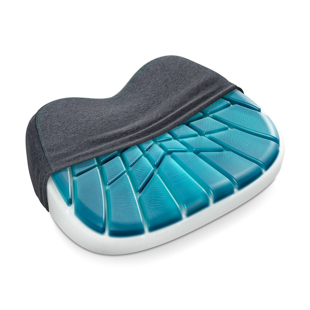 車椅子用シートクッションの開発経験を活かし、長時間座っていても負担のかからないスーパーフィット構造を採用。背骨に続く仙骨の位置を安定させ、坐骨の圧力を吸収、座った時に自然な姿勢に導くようにジェルの形状が工夫されています。底つき感がなく、長時間座ったままのお尻を柔らかく包み込み背骨がきれいなS字カーブの姿勢に促すことで、腰に負担がかからず腰痛予防に繋がります。