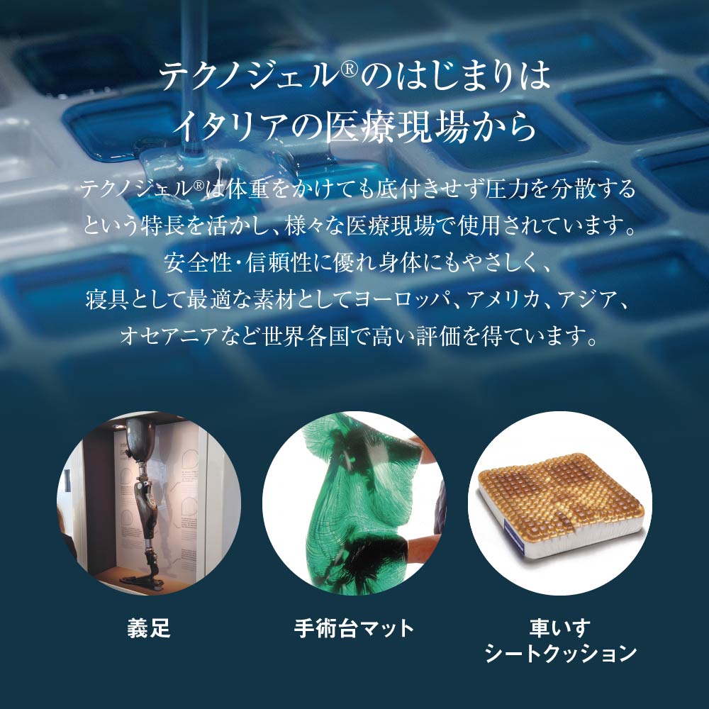 テクノジェルはもともと、医療分野からうまれたイタリア発の高機能特殊ジェルです。血行を妨げにくく、体にかかる負担を軽減する体圧分散性、柔軟性、耐久性にも優れているため、枕に使用することで、頭や首にフィットしやすく寝返りもスムーズに行えます。