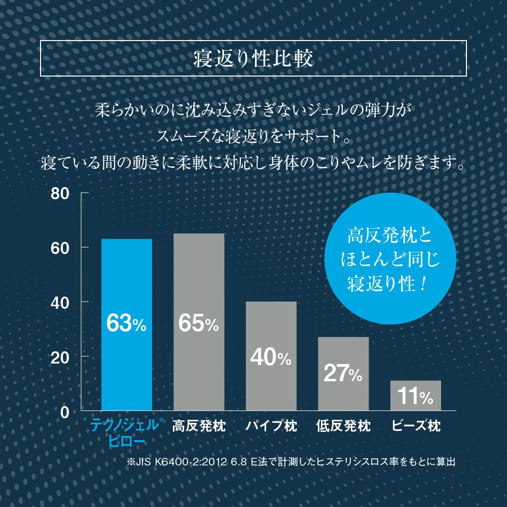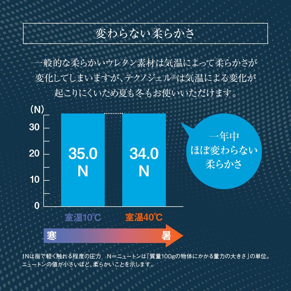 テクノジェルは優れた熱伝導性により、睡眠中に体から発散される汗や熱をすばやく吸収し分散。革新的なグリッド構造が空気の流れを促進し、ムレを防ぎながら快適な温度を保つことで熟睡へと導きます。