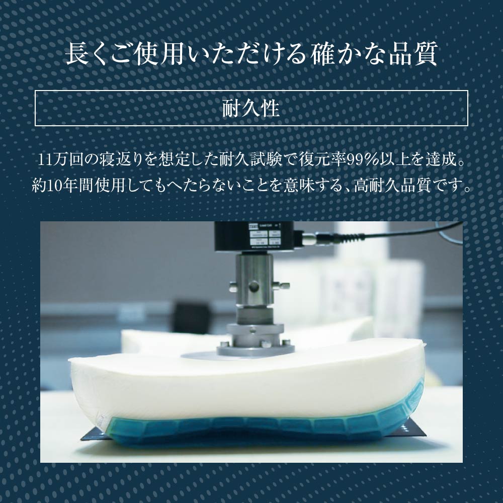 毎日使用する枕は、使用につれ高さや支える力が低下する点が気になるところ。特に支える力が低下した枕を使うと、フィット感や寝返りのしやすさも損なわれます。「アナトミック カーブピロー」は約10年分の寝返りを想定した耐久試験で復元率99%以上を達成しており、フィット感も寝返りのしやすさも変わらない枕です。